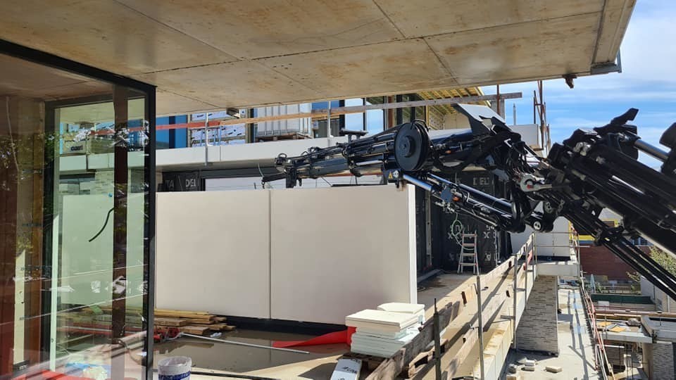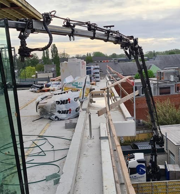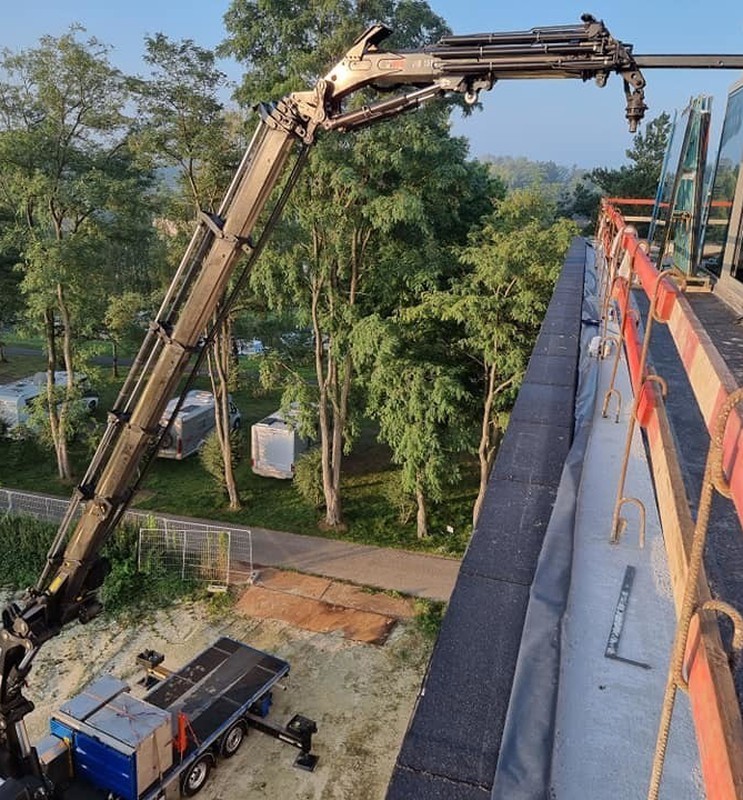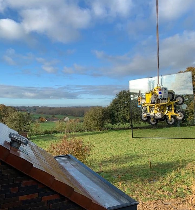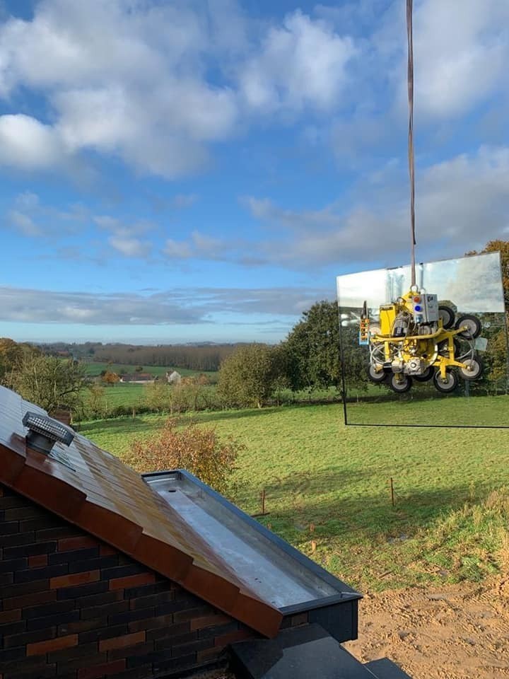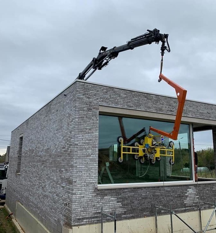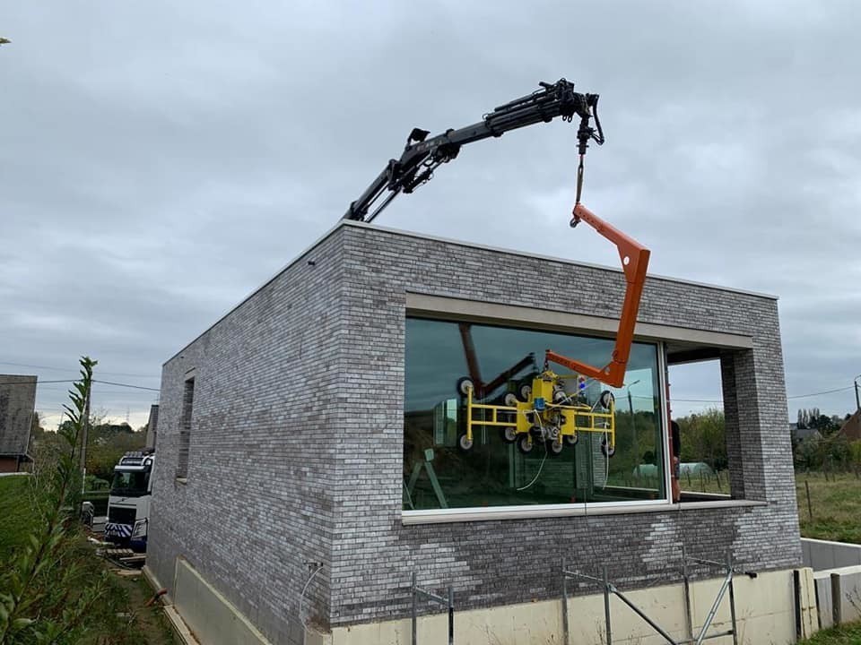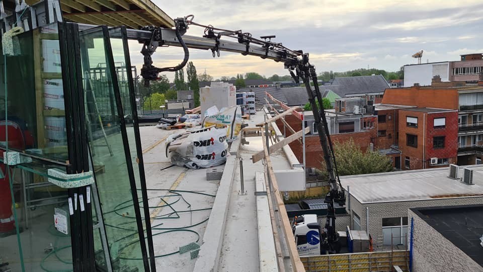 Met een kraanbereik tot 36 meter kunnen glaspartijen vlot over of achter gebouwen heen gepositioneerd worden.