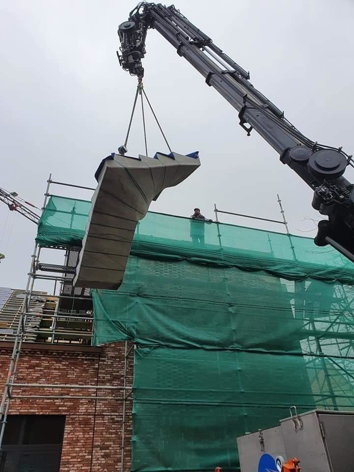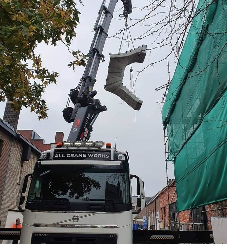 Het plaatsen van trappen en zware constructiedelen vraagt precisie. Wij hijsen en positioneren gecontroleerd, tot alles perfect zit.