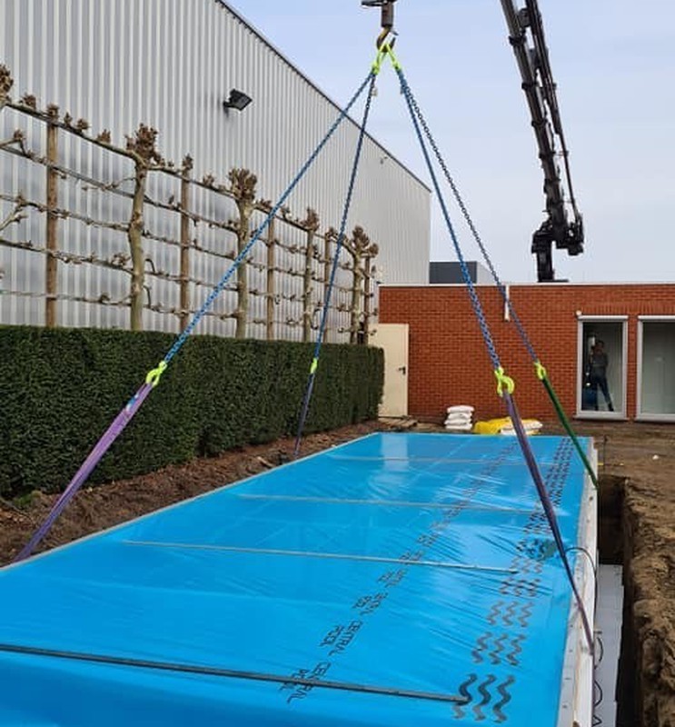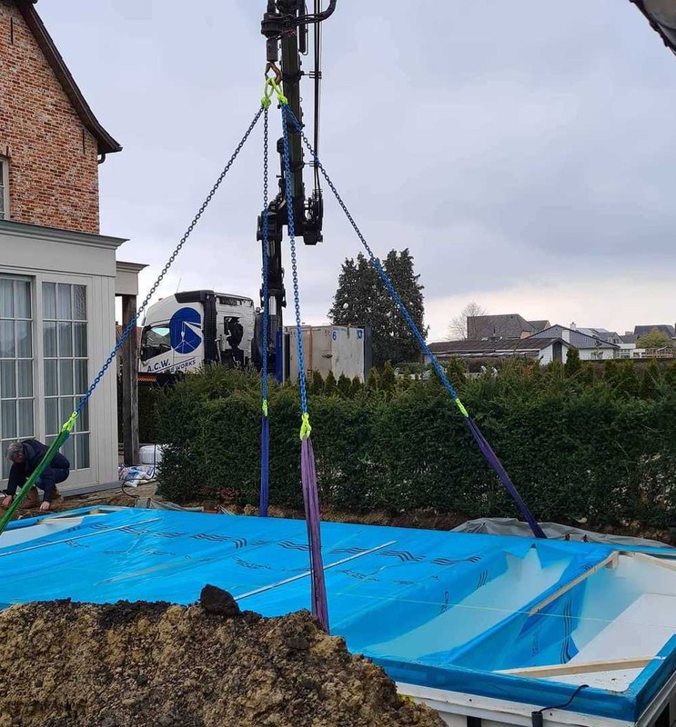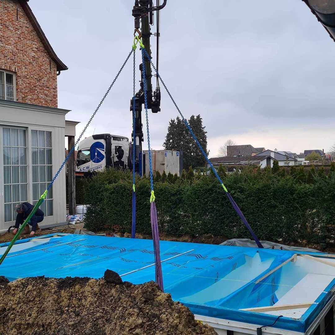 Het plaatsen van keerwanden en andere zware materialen gebeurt met de juiste hijsmiddelen en een gecontroleerde aanpak.