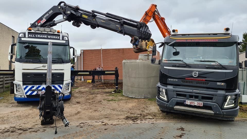 Denk aan het plaatsen van waterputten, het positioneren van materialen op de werf, het plaatsen van keerwanden of andere elementen die “aan de kraan kunnen hangen”. Met een kraanbereik tot 36 meter en een hydraulische lier vinden we vaak ook een oplossing bij moeilijke locaties of beperkte ruimte.